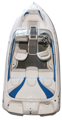 Zwei Einzelsitze vorn, große Sonnenliege am Heck